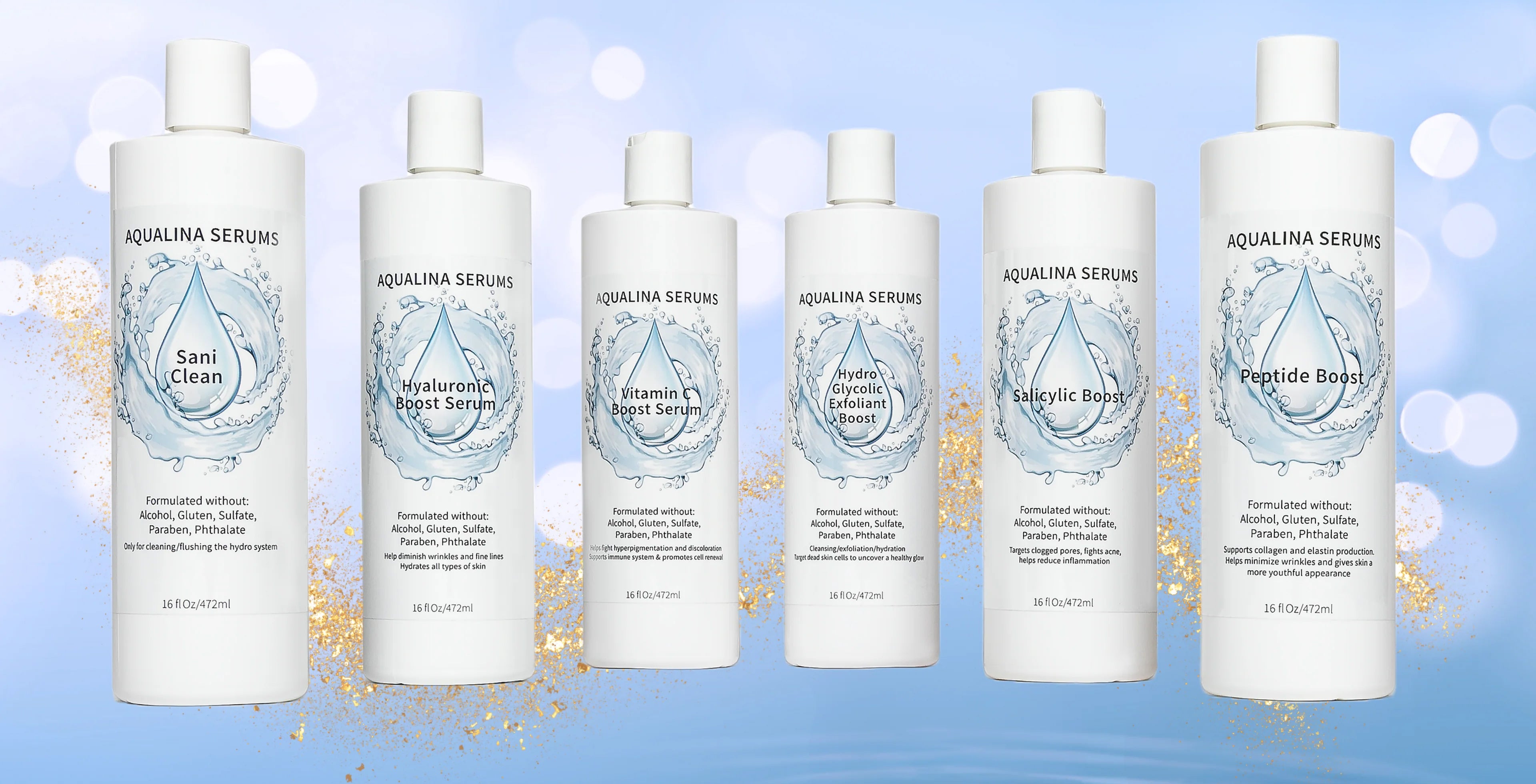 Aqualina serums feature various active formulas to regenerate skin cells in both young and aged skin to promote youthfulness using all natural ingredients. Our products are formulated with no alcohol, gluten, sulfates, parabens, or phthalates, to ensure your skin is absorbing only the purest and healthiest ingredients. Aqualina carries a variety of serums to target and heal various skin concerns from the inside out. These products are perfect for use in hydrodermabasion and oxygen infusion systems.